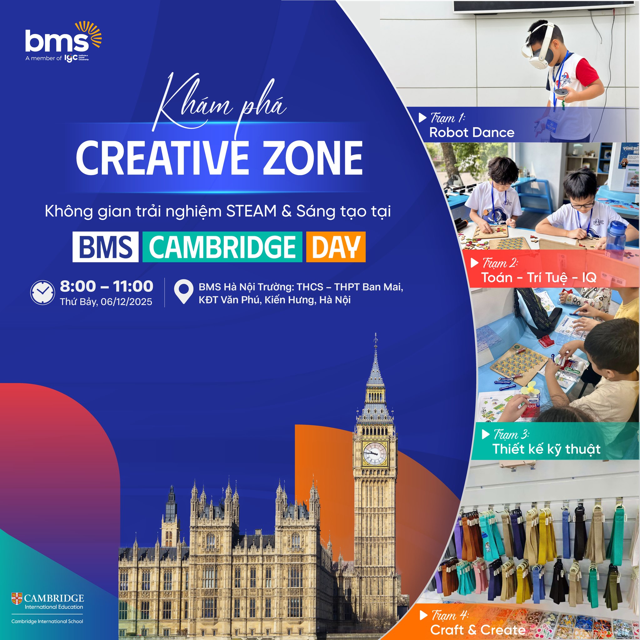 BMS Cambridge Day là sự kiện dành cho cha mẹ, học sinh từ 4 đến 14 tuổi, mở ra cơ hội trải nghiệm, khám phá và định hướng lộ trình học tập quốc tế. Tại đây, học sinh tham gia các hoạt động học tập sáng tạo, dự án trải nghiệm, kết nối trực tiếp với đội ngũ giáo viên, chuyên gia học thuật và các đối tác giáo dục uy tín toàn cầu.
