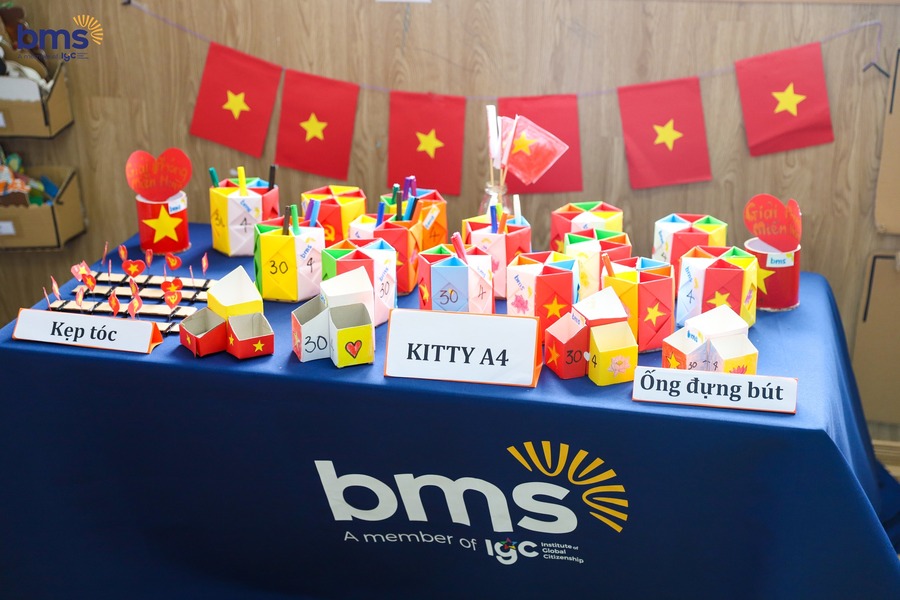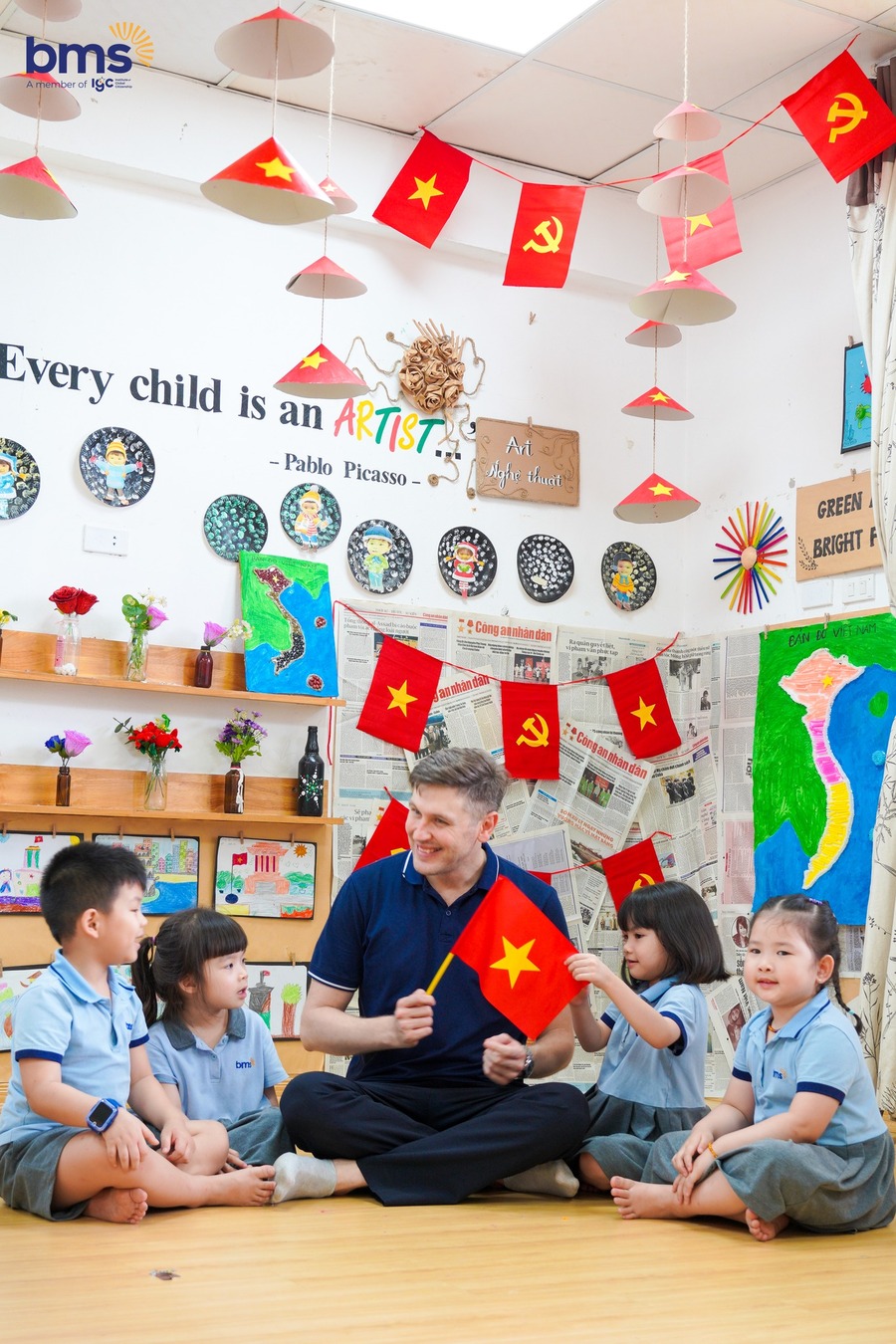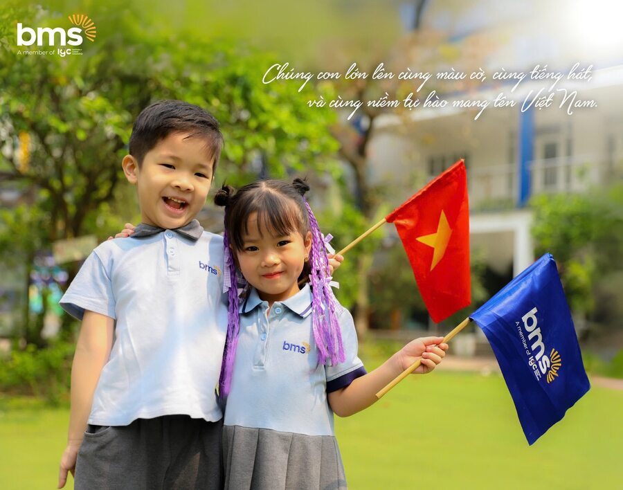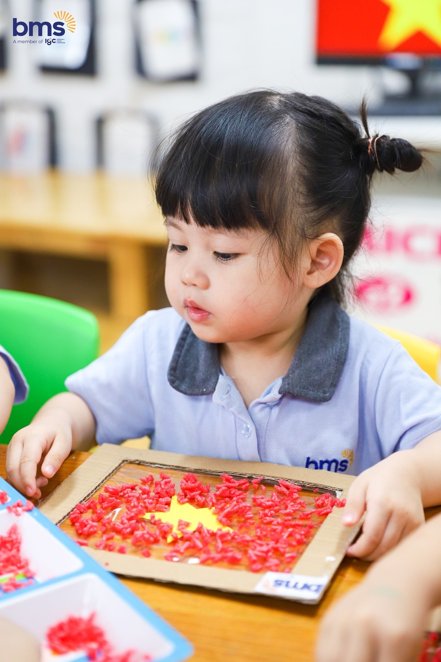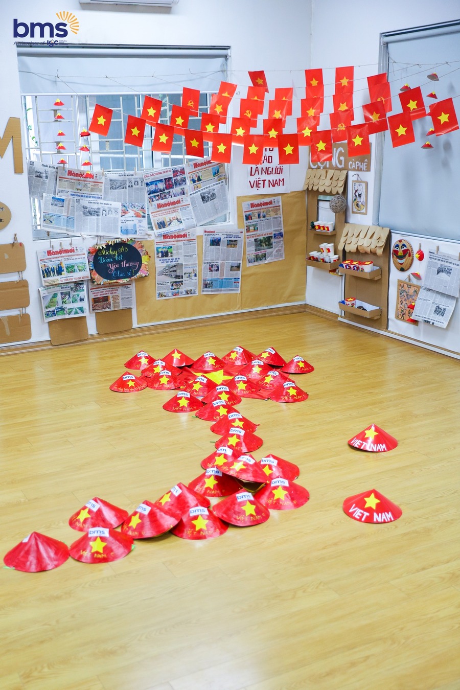 Trong không gian lớp học tại BMS, những mảnh giấy tái chế, vỏ chai nhựa, vải vụn hay chiếc lá khô…đã được “hô biến” thành cờ Tổ quốc, bản đồ Việt Nam rực rỡ, những hình ảnh biểu tượng của thiên nhiên, đất nước. Mặc dù các con còn rất nhỏ nhưng rất hào hứng khi tự tay cắt dán, vẽ hình ảnh quê hương - thể hiện sự tự hào dân tộc, cùng tình yêu và trách nhiệm với môi trường.