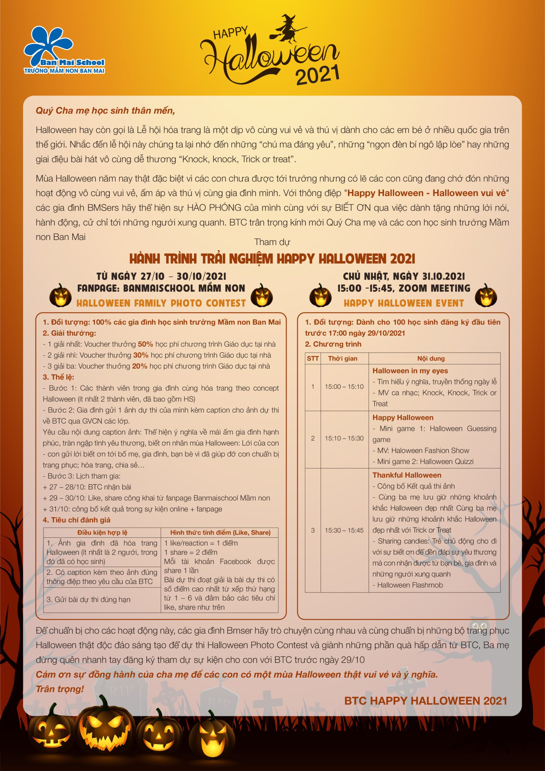 Halloween năm nay thật đặc biệt vì các con chưa được tới trường nhưng có lẽ các con cũng đang chờ đón những hoạt động vô cùng vui vẻ, ấm áp và thú vị cùng gia đình mình. Với mong muốn tạo nên một đại tiệc Halloween thật đáng nhớ cho các con và là nơi lưu giữ những khoảnh khắc vui tươi của các con cùng gia đình, Ban Mai trân trọng tổ chức chuỗi sự kiện tuần lễ Halloween:Ngày 27 – 30/10: Halloween Family Photo Contest (Cuộc thi ảnh gia đình Halloween)