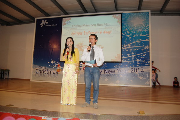 Cô giáo Hoàng Thanh Vân và thầy giáo Trà Đức Hiếu với vai trò MC đã cùng trò chuyện với các bé về ý nghĩa của ngày 8/3. Đối với Trường Mầm non Ban Mai, ngày 8/3 là dịp để các bé tỏ lòng biết ơn, kính trọng và nói lời yêu thương tới các cô giáo, các bà, mẹ và chị, …những người thân yêu của bé. Ngay từ đầu tuần các cô giáo đã tổ chức chùm hoạt động chào mừng ngày 8/3: Tổ chức cho các bé làm bưu thiếp chúc mừng, làm quà tặng bà, tặng mẹ…Tập nói lời yêu thương, cảm ơn thật tình cảm với bà, mẹ; Các bé còn có dịp để kể lại với cô giáo và bạn bè những kỷ niệm sâu sắc của mình với bà, mẹ. Đặc biệt các cô còn ghi hình lại các hoạt động của lớp để trình chiếu tại buổi Lễ hôm nay.