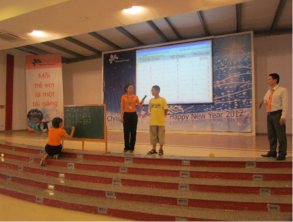 Các con Mầm non vào sàn thi đấu trước. Nhìn các con 4-5 tuổi ngồi giữa sân thi đấu tính toán và giơ bảng kết quả lên sau khi kết thúc mỗi câu hỏi, tất cả phụ huynh ở dưới đều xúc động. Không ngờ những em bé ở nhà còn nũng nịu, có khi còn chưa tự xúc cơm ăn được đã trở nên nhanh nhẹn, tự tin và đặc biệt tính toán nhanh và chính xác. Các anh chị tiểu học thì nhanh hơn, tự tin hơn.