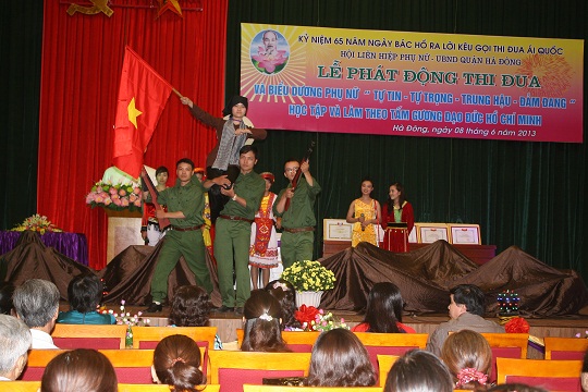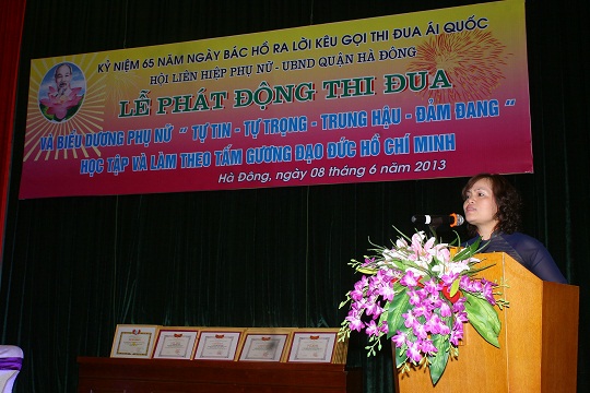 Phát biểu tại buổi lễ, đồng chí Nguyễn Thị Hảo – Chủ tịch Hội LHPN Q. Hà Đông đã ôn lại truyền thống của phụ nữ Việt Nam anh hùng, bất khuất, trung hậu, đảm đang trong các thời kỳ của đất nước. Đặc biệt truyền thống ấy càng được phát huy trong thời kỳ công nghiệp hóa, hiện đại hóa và hội nhập quốc tế bằng những phong trào thi đua cụ thể, thiết thực như: “Giỏi việc nước, đảm việc nhà”, “Lao động giỏi”, “Phụ nữ tích cực học tập, lao động sáng tạo, xây dựng gia đình hạnh phúc”……