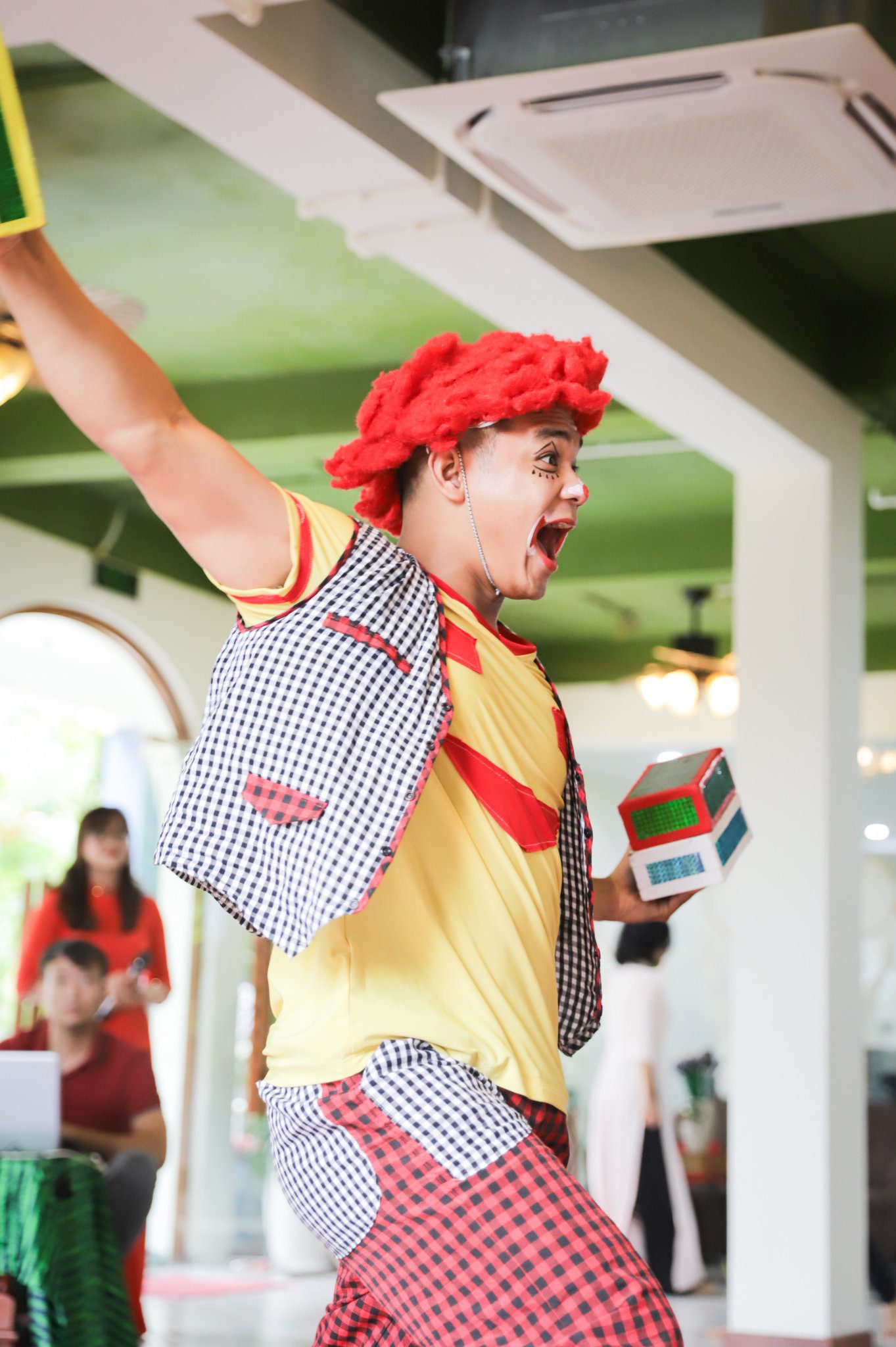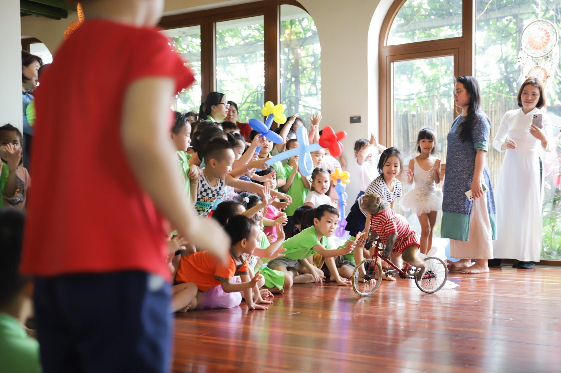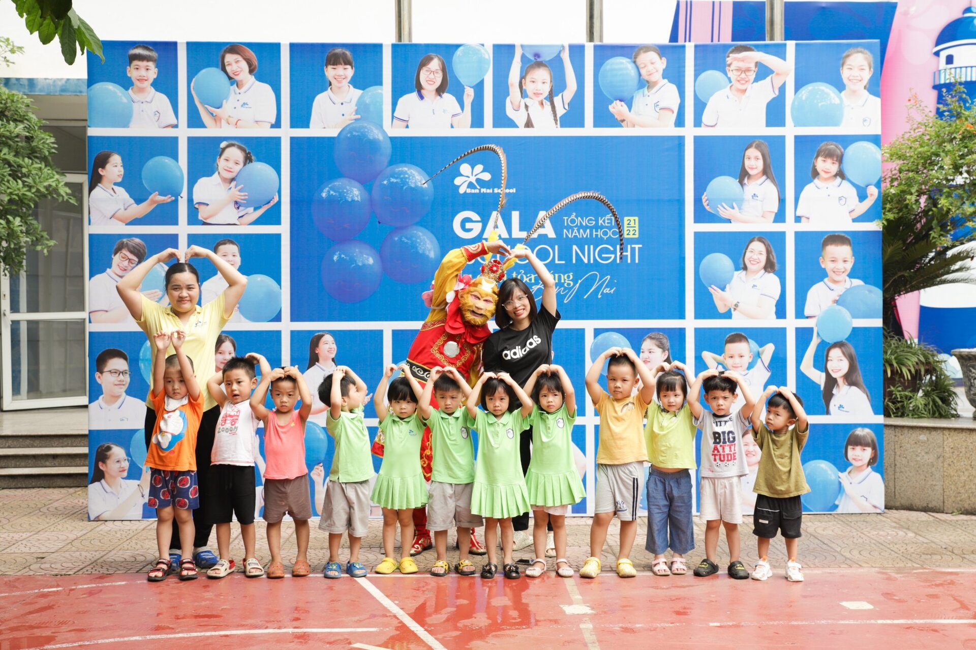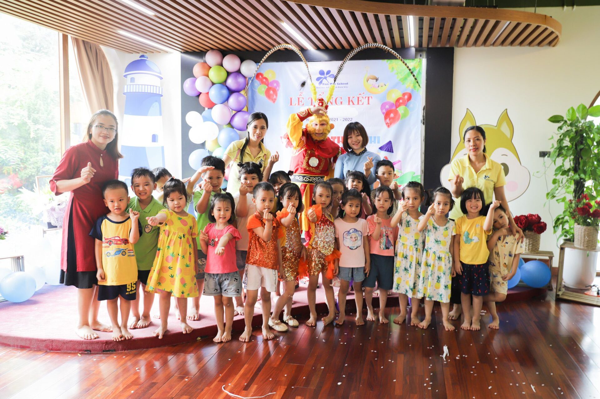 Ở khúc cao trào của chương trình, các con đã có dịp “mắt chữ O, miệng chữ A” trước sự xuất hiện của các Anh Hề, Tôn Ngộ Không và đặc biệt là Chú Khỉ vô cùng đáng yêu, ngộ nghĩnh. Các con không quên níu chân Tề Thiên Đại Thánh để lưu giữ những bức ảnh cùng tập thể lớp mình, những người bạn sẽ cùng các con bước tiếp trên hành trình nuôi dưỡng những em bé hạnh phúc tại Ban Mai.
