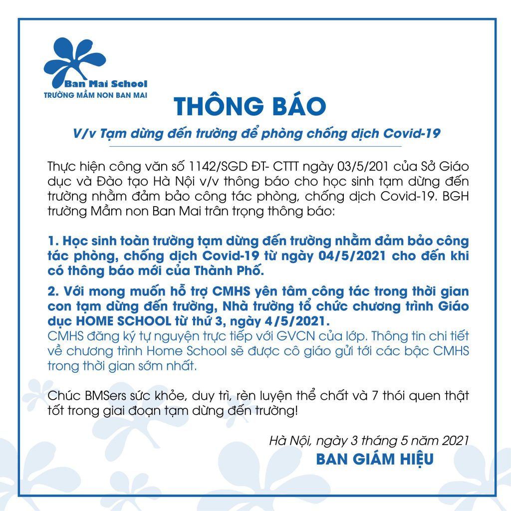 Thực hiện công văn số 1142/SGD ĐT- CTTT ngày 03/5/201 của Sở Giáo dục và Đào tạo Hà Nội v/v thông báo cho học sinh tạm dừng đến trường nhằm đảm bảo công tác phòng, chống dịch Covid-19. BGH trường Mầm non Ban Mai trân trọng thông báo