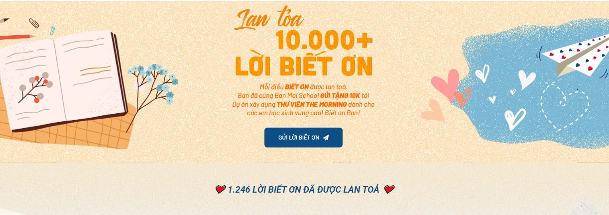Mỗi lời BIẾT ƠN được khởi tạo tại: https://old.banmaischool.edu.vn/tam-biet-on/ là bạn đã cùng Ban Mai gửi tặng 10.000 đồng tới gây quỹ xây dựng Thư viện The Morning dành cho các em học sinh vùng cao!
