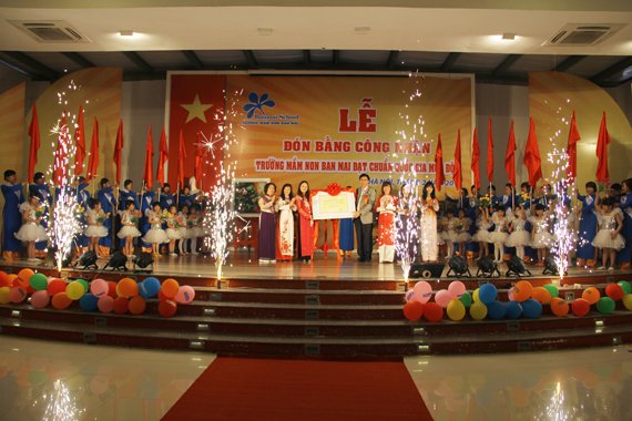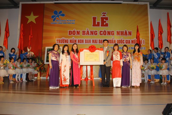 Sáng nay (2/02/2013) trường mầm non Ban Mai đã tổ chức buổi Lễ đón Bằng công nhận trường mầm non Ban Mai đạt chuẩn Quốc gia mức độ I. Trong làn nắng mới ấm áp, những nụ đào hồng chúm chím cười, những bông mai vàng đua nhau khoe sắc- Ban Mai được trang hoàng với những băng rôn và rực rỡ cờ hoa. Các cô giáo và các bé hôm nay cũng xinh tươi hơn làm cho không khí mùa xuân của Ban Mai thêm xinh đẹp. Sau bao nhiêu khó khăn vất vả với cả sự cố gắng không ngừng thì ngày mong đợi đã đến. Vẫn biết thế mà sao cứ thấy hồi hộp và xúc động lạ.