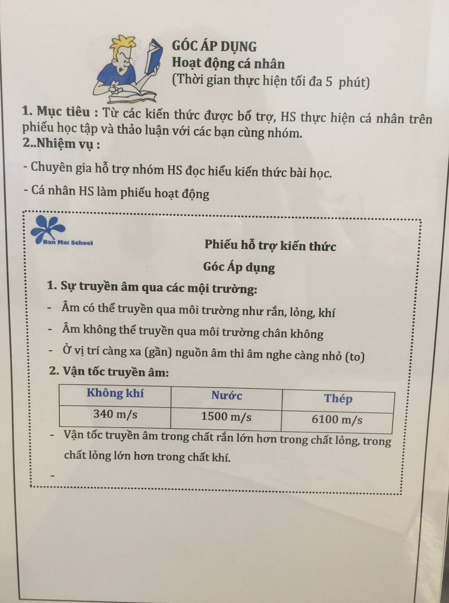 “Môi trường truyền âm”- Vật lý 7 là 1 bài học có nội dung rất phù hợp hợp cho việc tổ chức mô hình lớp học như vậy. Bên cạnh đó, kĩ thuật dạy học cũng có 1 vai trò vô cùng quan trọng để phát huy tối đa hiệu quả học tập của học sinh. Và trong bài học này, “kĩ thuật chuyên gia” đã khẳng định rất rõ điều đó. Chính những bạn học sinh có năng lực tốt đã trở thành chuyên gia hướng dẫn cho các bạn mình chinh phục kiến thức một cách vừa đơn giản, dễ hiểu nhưng vẫn đảm bảo yếu tố khoa học.