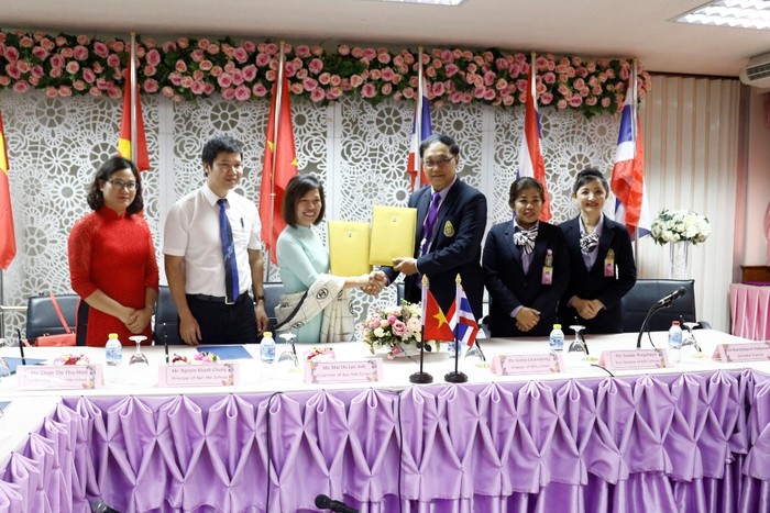 | Lãnh đạo hệ thống giáo dục Ban Mai ký kết hợp tác với trường Kachanapisek Wittayalai Nakhon Pathom (Thái Lan). Ảnh: NTCC |