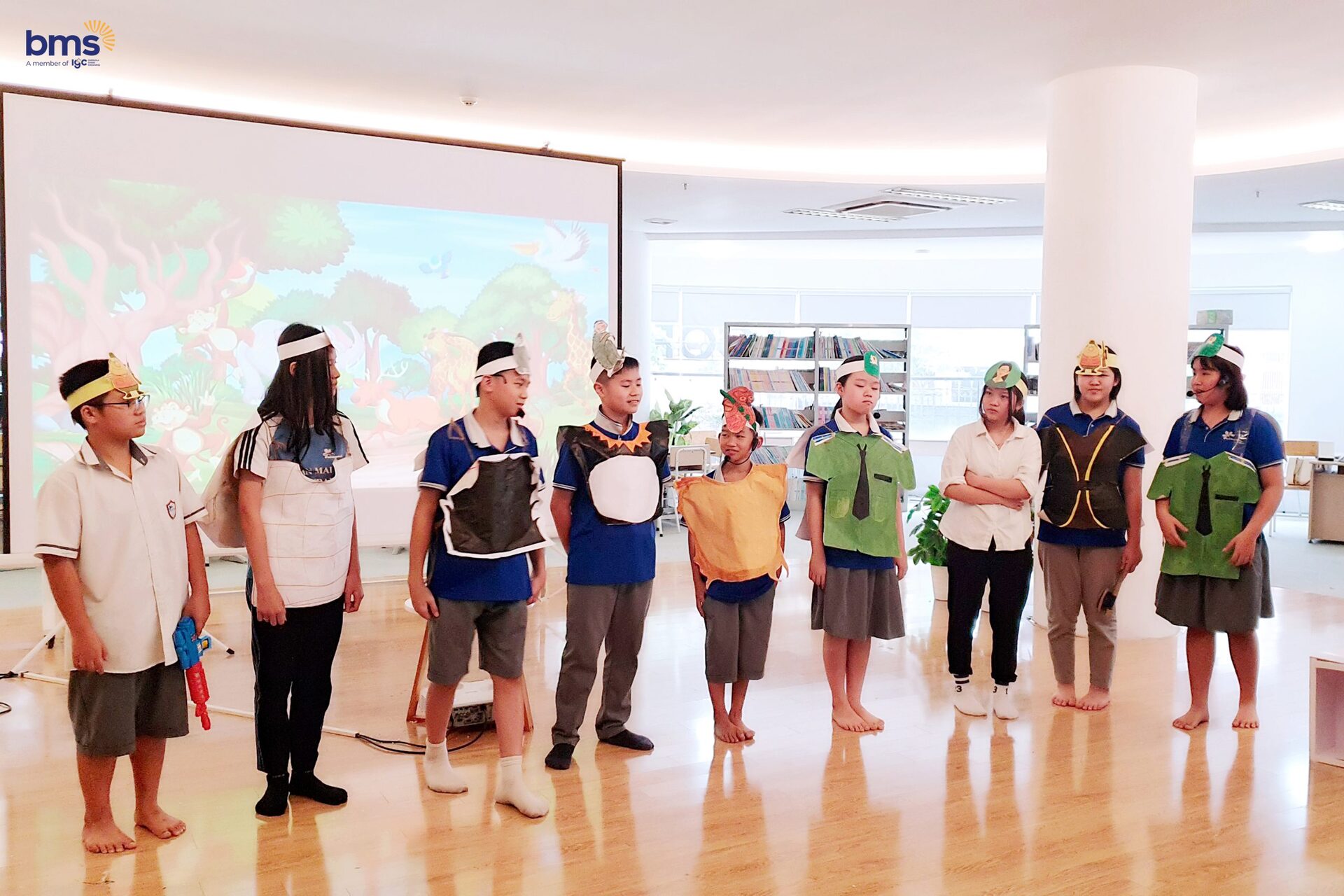 Phát huy thế mạnh là năng lực ngôn ngữ, các bạn lớp 6i1 và 6i2 đã hợp lực cùng nhau trong 1 vở kịch đầy ý nghĩa nhân văn “Biodiversity”. Các học sinh đã hóa thân vào các vai diễn: Culi nhỏ, vượn má trắng phía nam, vooc chà vá chân xám, rùa sa nhân, thợ săn, kiểm lâm, giáo viên…để tái hiện những loài vật đang gặp nguy hiểm và kêu cứu. Các nhân vật cũng nhắn gửi tới các bạn học sinh BMS nói riêng và các bạn học sinh trên thế giới nói chung hãy cùng nhau thể hiện tình yêu, sự tôn trọng với thiên nhiên để bảo vệ Đa dạng sinh học- con người chúng ta là một phần trong đó.