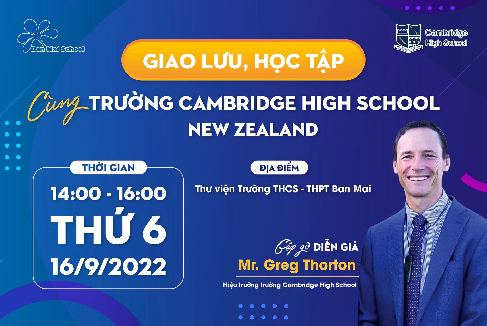 Ngay trong những ngày đầu tiên của năm học mới 2022 – 2023, Thầy và trò Trường THCS – THPT Ban Mai sẽ được đón tiếp Thầy Mr. Greg Thorton – Hiệu trưởng trường Cambridge High School và đoàn các Thầy Cô giáo Trường Cambridge High School – New Zealand đến thăm, giao lưu, làm việc tại Ban Mai School.