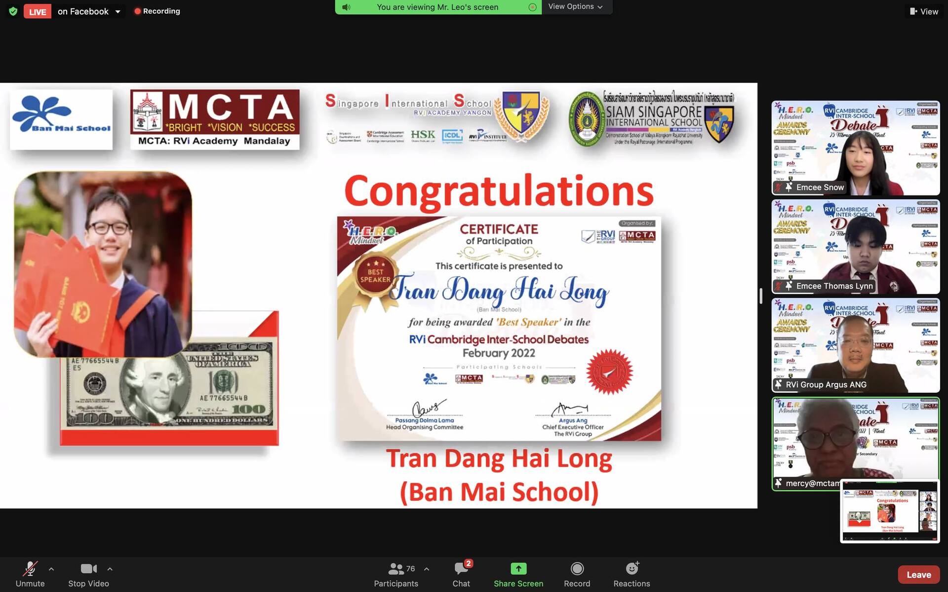 Đội Ban Mai Upper Team đã về vị trí thứ Hai chung cuộc với tỉ số sát sao. Học sinh Trần Đăng Hải Long lớp 10T của Ban Mai đã xuất sắc giành giải Best Speaker của nhóm THPT và nhận giải thưởng trị giá 100$ cùng với chứng nhận của chương trình.