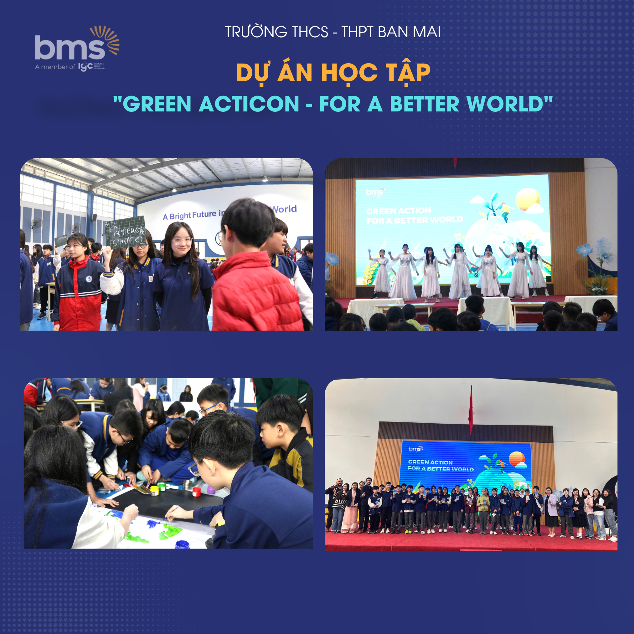 Bằng cách tích cực chia sẻ về các hoạt động bảo vệ môi trường và phát triển cộng đồng, học sinh BMS hiểu rõ hơn về các thách thức toàn cầu và phát triển thái độ sống có trách nhiệm. Dự án "GREEN ACTICON - FOR A BETTER WORLD" và "ACT TODAY – SAVE TOMORROW" giúp học sinh nâng cao nhận thức về các vấn đề môi trường và xã hội. Những hành động này giúp học sinh trở thành những công dân có ý thức xã hội, sẵn sàng đóng góp vào việc xây dựng một thế giới bền vững và nhân văn.