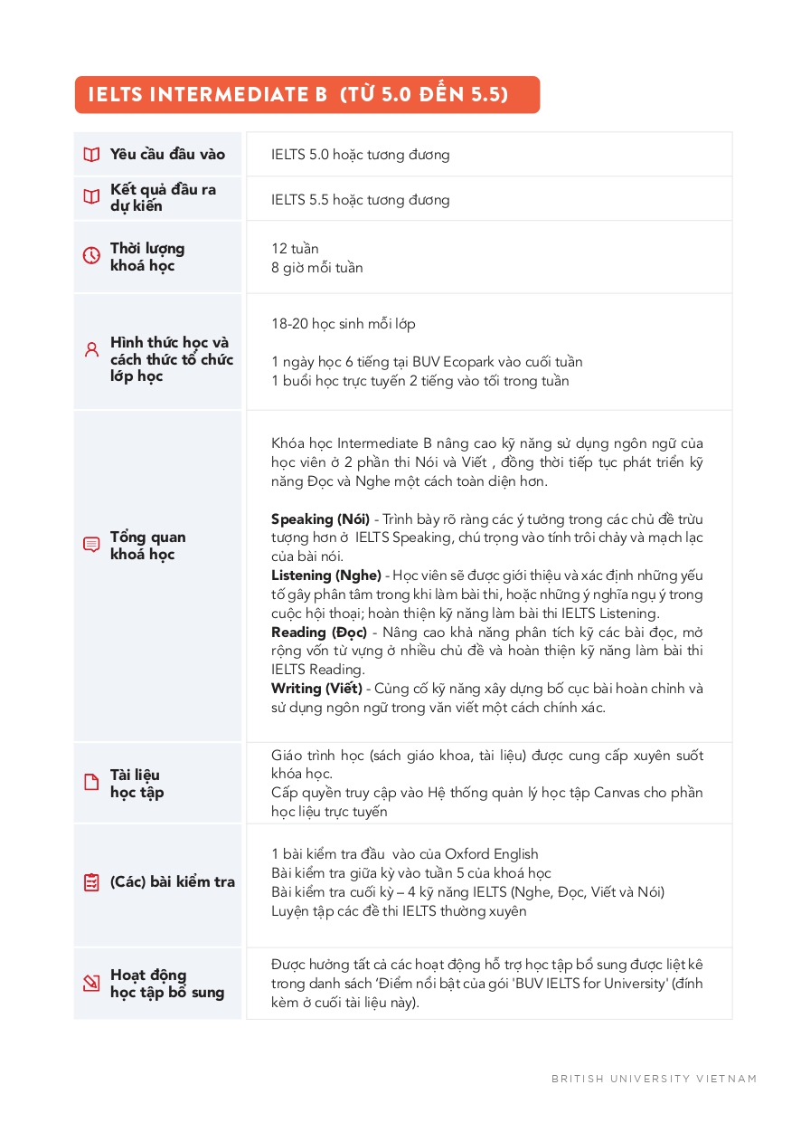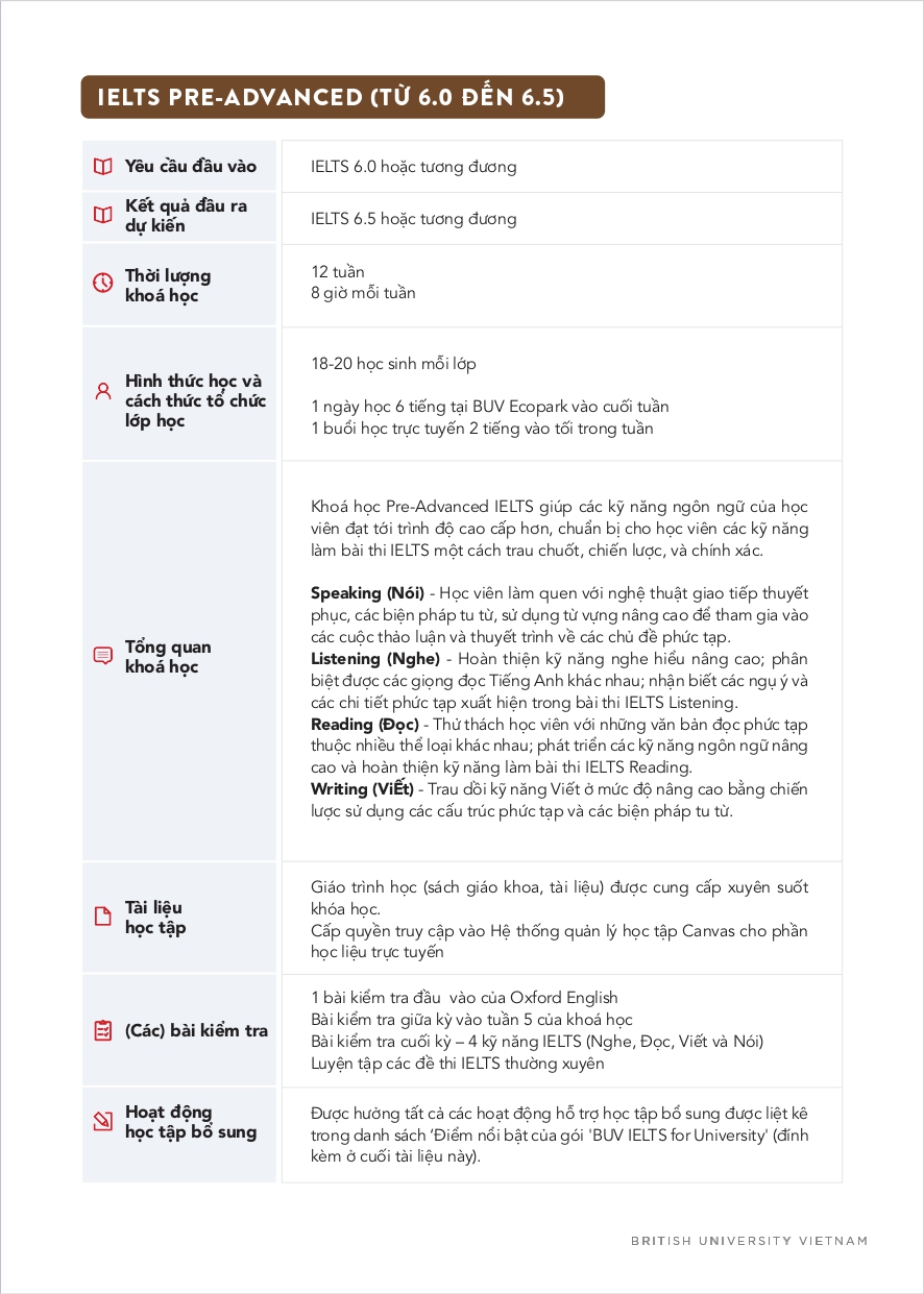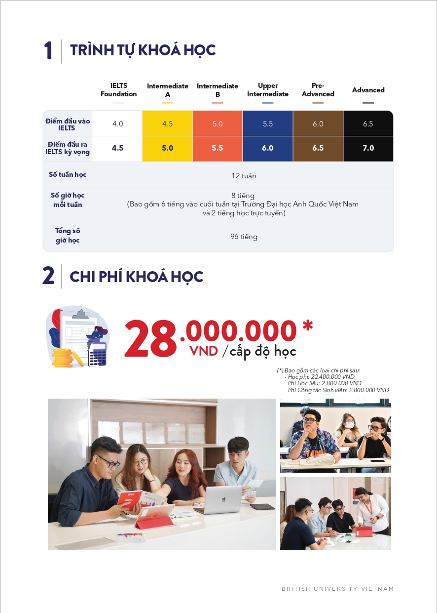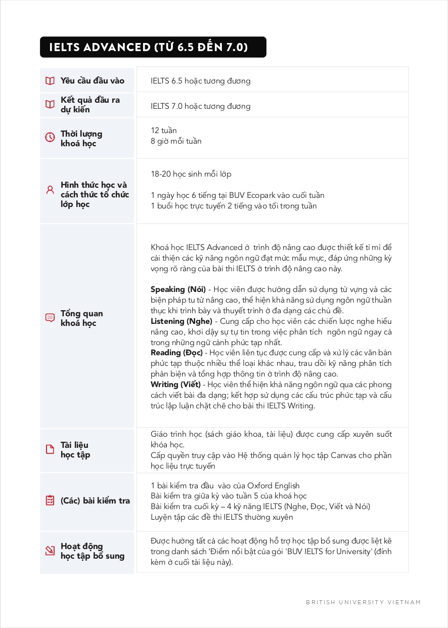 Chương trình IELTS for University của BUV được giảng dạy bởi đội ngũ giáo viên bản ngữ giàu kinh nghiệm, đồng thời được thiết kế và giảng dạy theo tiêu chuẩn Anh Quốc.