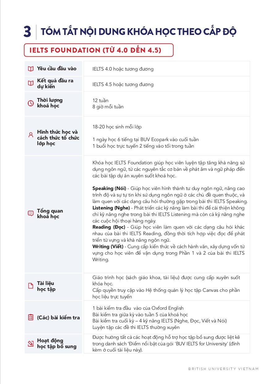 • IELTS Foundation (từ 4.0 đến 4.5)