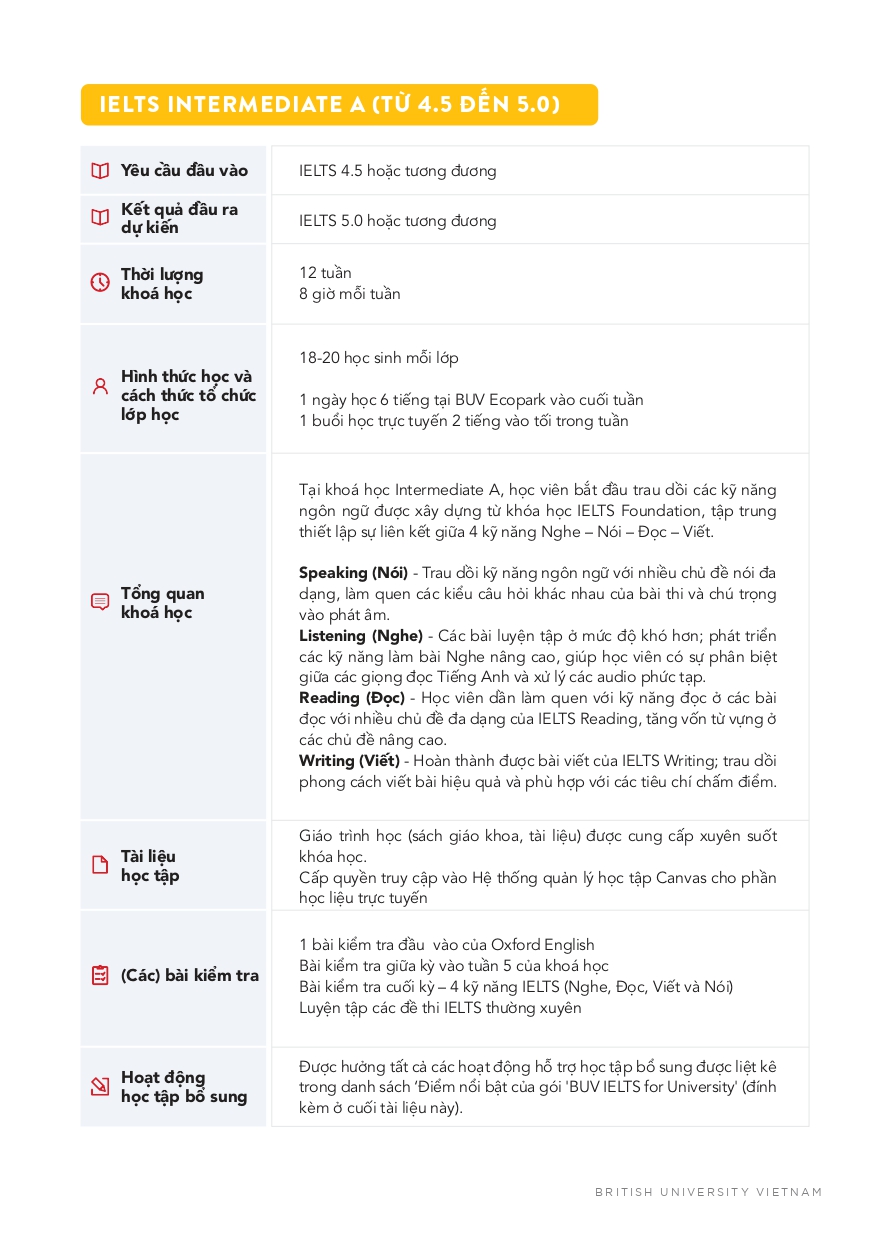• IELTS Intermediate A (từ 4.5 đến 5.0)