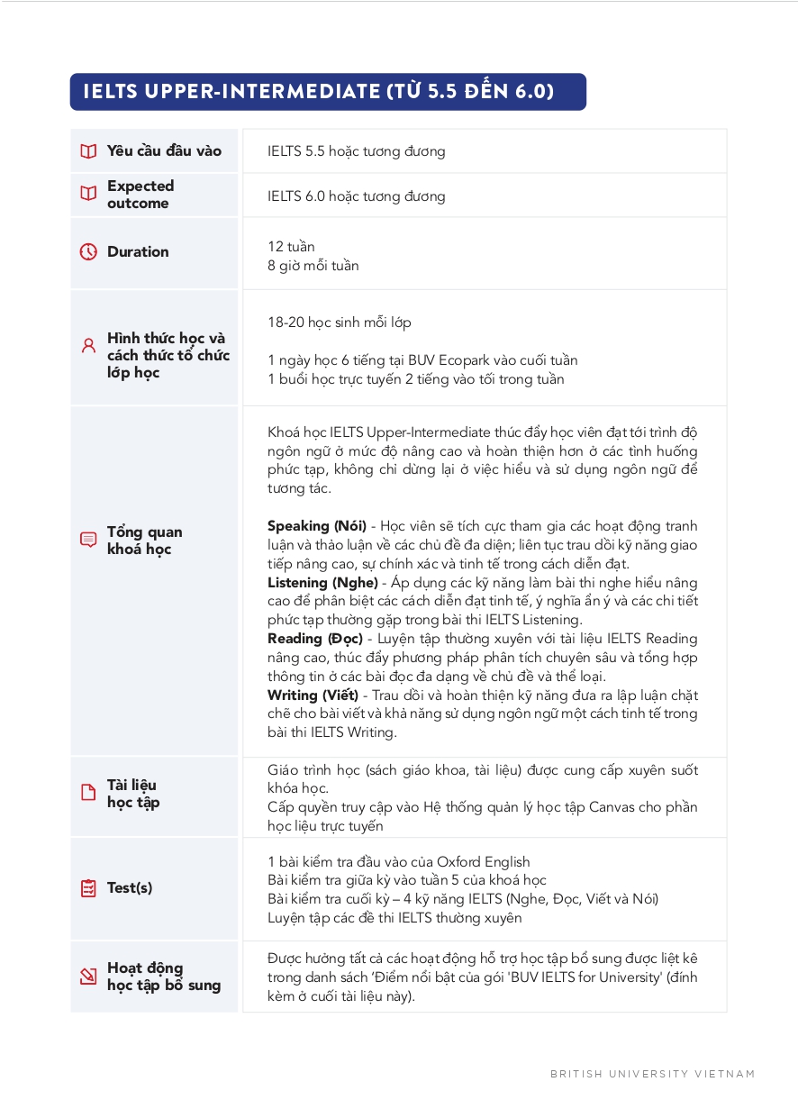 • Được hỗ trợ lệ phí tham dự kỳ thi thi IELTS chính thức vào cuối khóa học IELTS Upper-Intermediate.