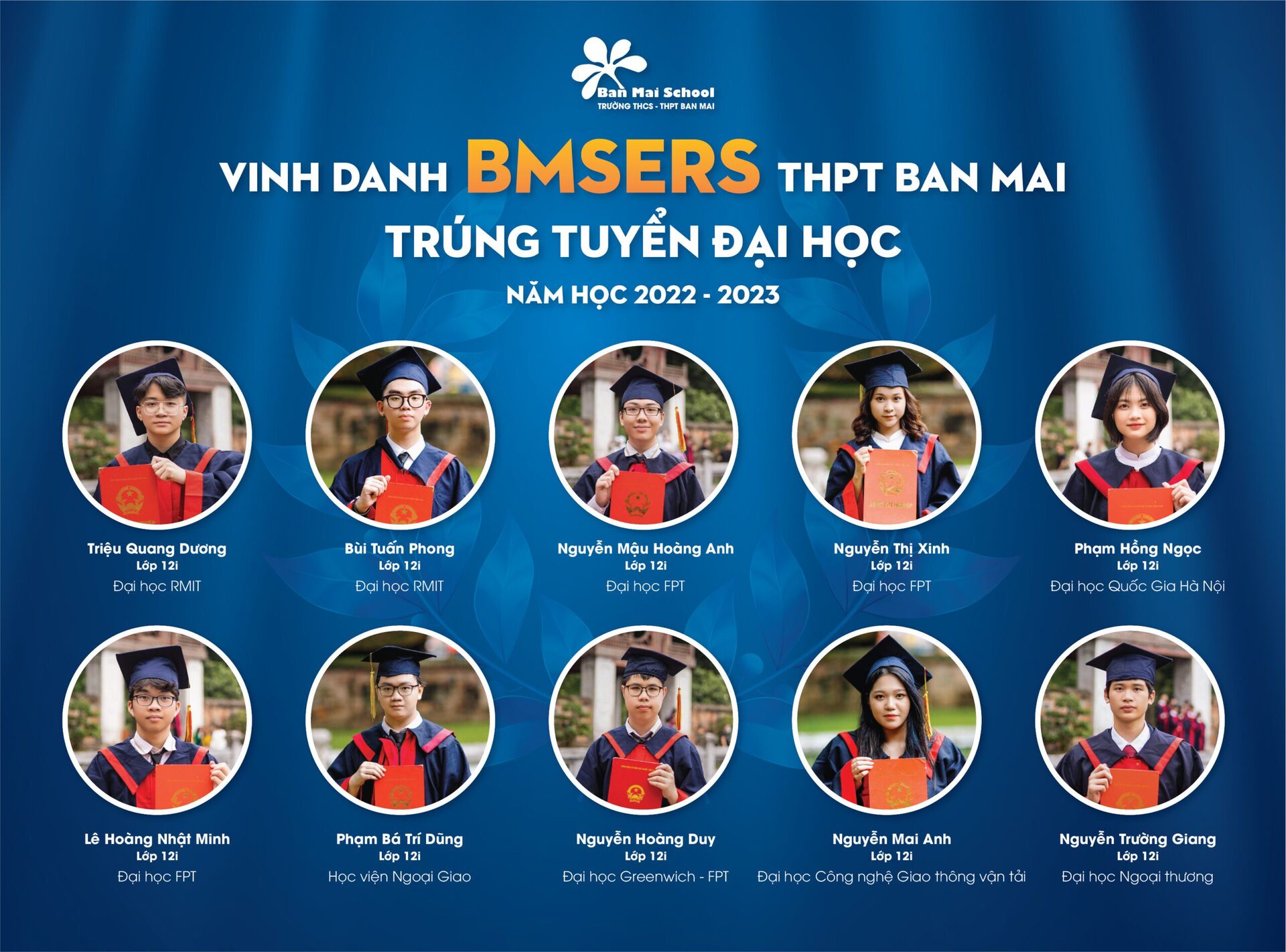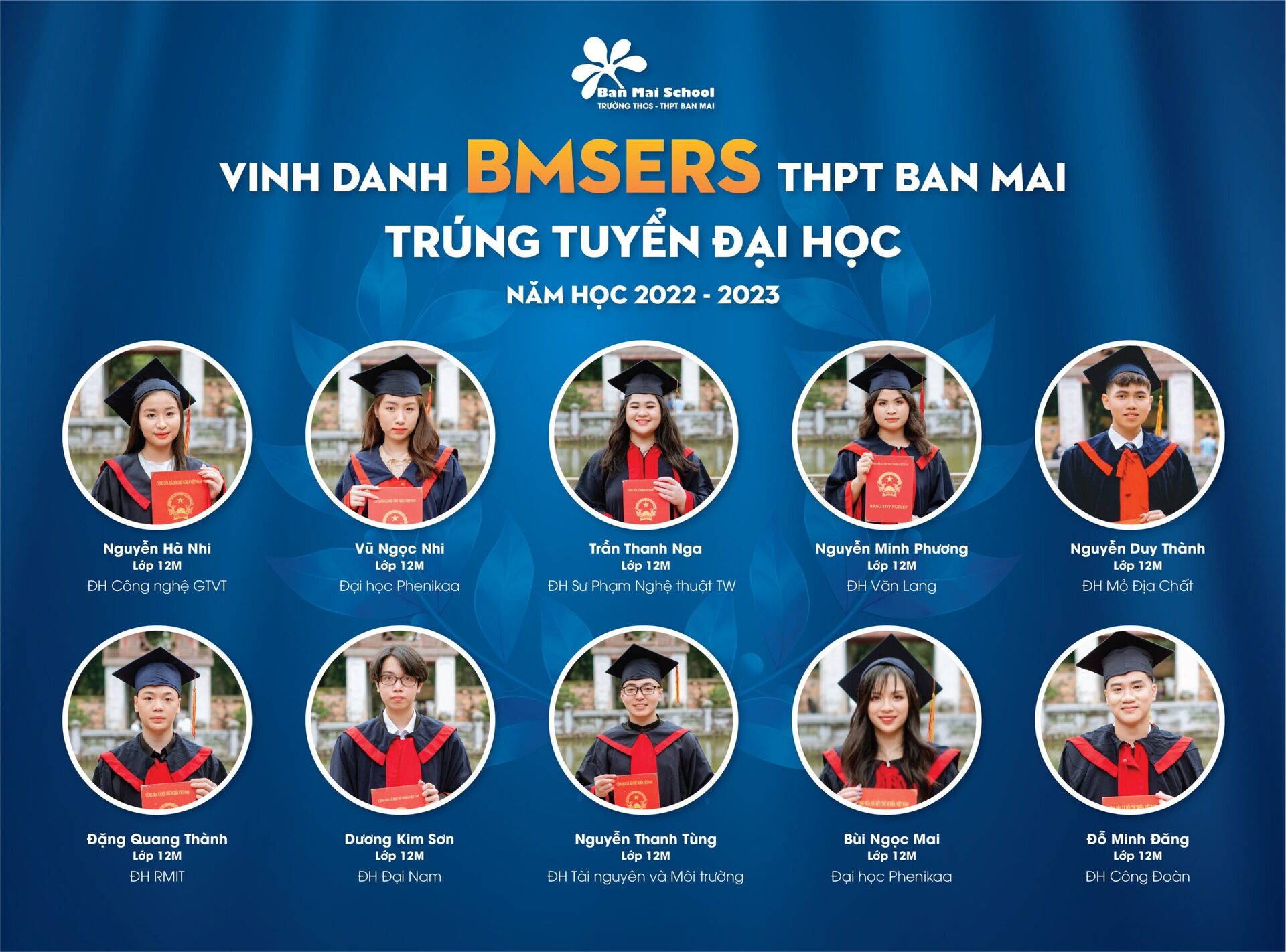 Năm học 2021 – 2022 của Trường THPT Ban Mai (Hà Đông) ghi dấu những thành tích đáng tự hào của Thầy và trò Nhà trường. Bên cạnh các huy chương, các giải thưởng học sinh giỏi các cấp trong nước và Quốc tế, Thầy cô chúc mừng và vinh danh các BMSers đạt thành tích cao: 100% học sinh đỗ tốt nghiệp THPT, 100% học sinh đỗ vào các trường ĐH, Cao đẳng và định hướng nghề. BMSers đã xuất sắc ghi danh vào các trường ĐH hàng đầu tại Việt Nam, trong đó có thể kể tới: ĐH Quốc gia Hà Nội, ĐH Bách Khoa, ĐH Ngoại Thương, ĐH Kinh tế Quốc dân, ĐH Hà Nội, ĐH Sư phạm, Học viện Ngân hàng,…