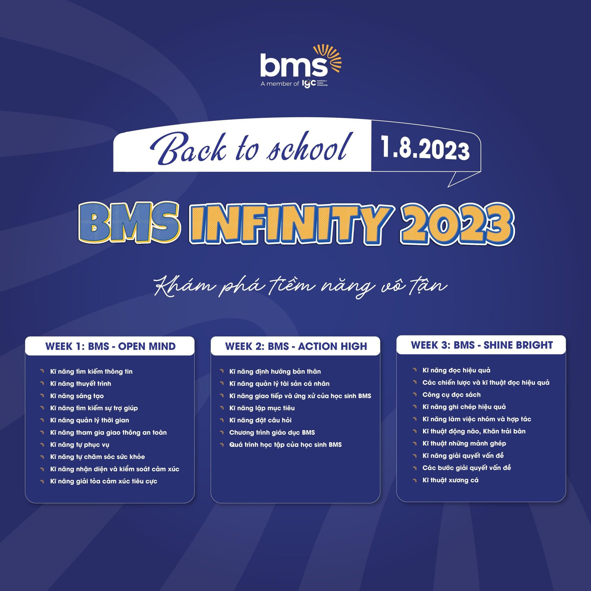 Chào mừng BMSers quay trở lại trường học với tuần định hướng đầy thú vị cùng chủ đề “BMS INFINITY 2023 – Khám phá tiềm năng vô tận”! Năm học 2023 – 2024 hứa hẹn sẽ là một hành trình thú vị đưa các bạn tiến xa hơn trên con đường trưởng thành và thành công.