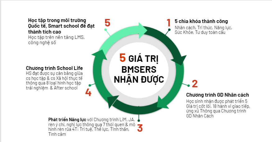 Với mô hình học tập nhiều sự lựa chọn, linh hoạt, đặc biệt quan trọng là giáo dục trong và ngoài lớp giúp học sinh tiếp thu tự nhiên, nhưng vẫn đồng nhất với tầm nhìn, sứ mệnh, triết lý giáo dục về ngôi trường quốc tế tôn trọng và đề cao văn hóa Việt.