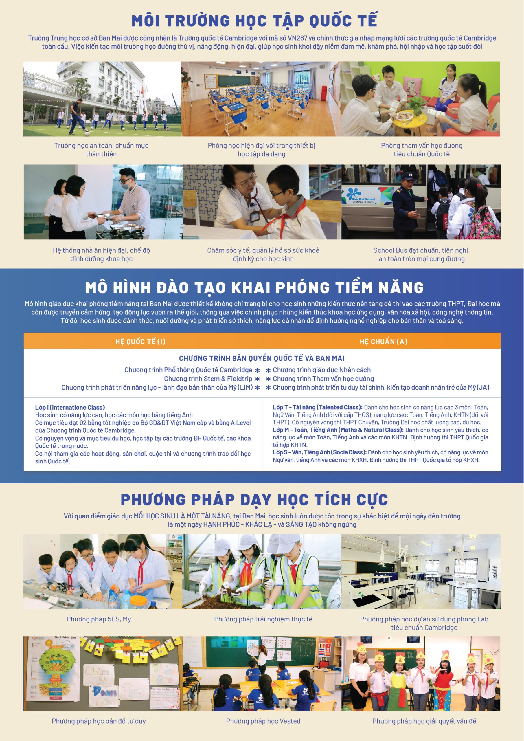 Trường THCS Ban Mai cung cấp chương trình giáo dục toàn diện. Mỗi học sinh Ban Mai đều có cơ hội lựa chọn 1 trong 2 Hệ đào tạo: Hệ chuẩn/Advanced (A) và Hệ Quốc tế/International (i)
