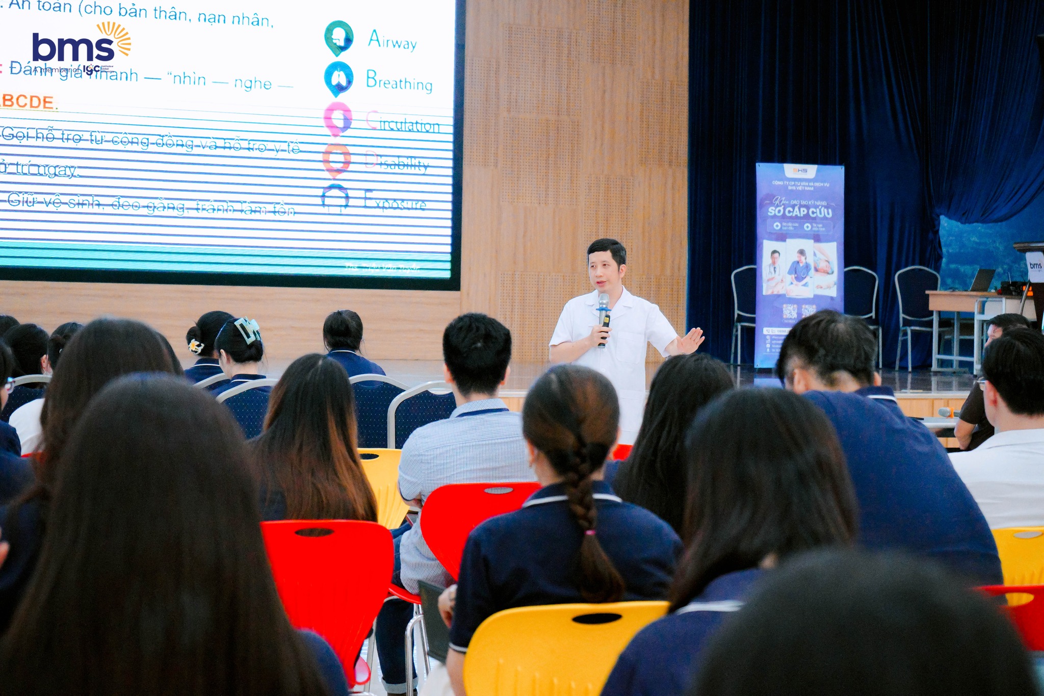 Nhằm nâng cao năng lực xử lý tình huống và đảm bảo an toàn cho học sinh, BMS Hà Nội: Trường THCS – THPT Ban Mai đã tổ chức chương trình tập huấn kiến thức và kỹ năng sơ cấp cứu dành cho cán bộ, giáo viên và nhân viên. Đây là hoạt động thiết thực giúp đội ngũ nhà trường củng cố kiến thức, rèn luyện kỹ năng và chủ động hơn trong công tác chăm sóc, hỗ trợ học sinh.