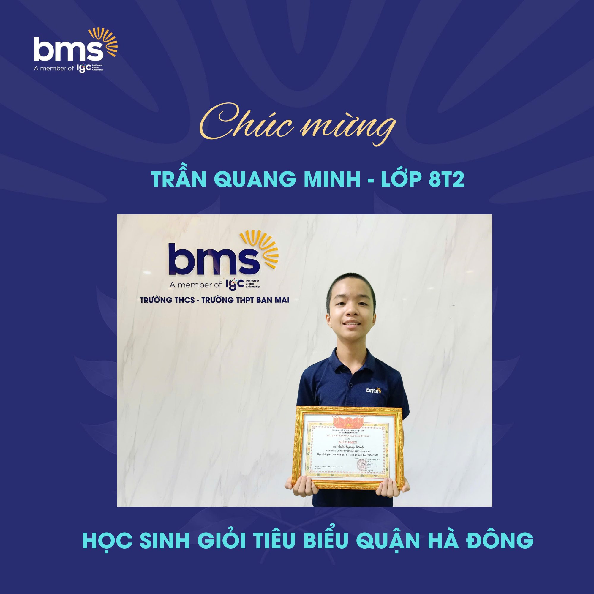 Chúc mừng học sinh Nguyễn Thành An và Nguyễn Anh Khôi – Lớp 9T1; Học sinh Trần Quang Minh – Lớp 8T2. Đây là ba học sinh tiêu biểu khối THCS – đại diện cho thế hệ học sinh BMS năng động, bản lĩnh, có ý chí học tập vững vàng và tinh thần kỷ luật cao – đã được công nhận là Học sinh Giỏi tiêu biểu cấp Quận Hà Đông.