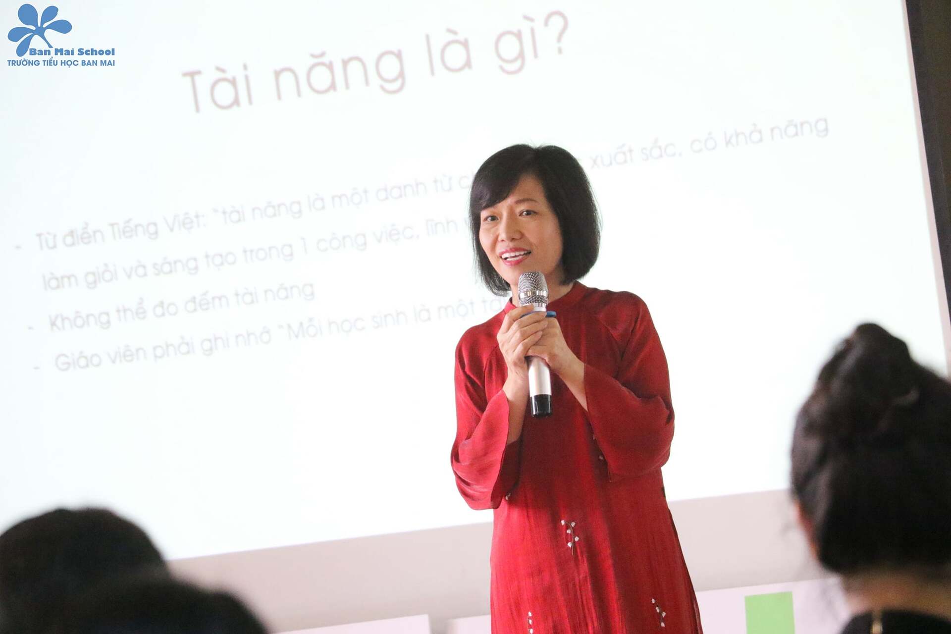 Ở phần đầu tiên của chương trình, Nhà giáo Mai Thị Lan Anh – Chủ tịch HĐQT Hệ thống Giáo dục Ban Mai đã chia sẻ cùng các bố mẹ về những phương pháp, kỹ năng giúp đánh thức tố chất thiên tài trong con, đồng thời giúp bố mẹ hiểu rõ hơn về quan điểm giáo dục “Mỗi học sinh là một tài năng – Tôn trọng sự khác biệt” tại Ban Mai.