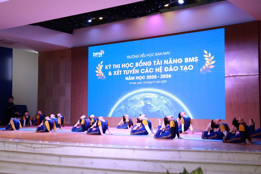 Trong khi các "sĩ tử nhí" thử sức với bài thi năng lực Ngôn ngữ - Tư duy - Tiếng Anh, các bậc Cha mẹ đã cùng tham gia Talkshow “Con thông minh theo cách nào?” cùng diễn giả nổi tiếng - cô Phan Hồ Điệp. Trong không gian hội trường ấm áp và tràn đầy năng lượng, chương trình mở đầu bằng một màn đồng diễn thể chất Nhật Bản đặc sắc do BMSers thực hiện. Từng động tác mạnh mẽ, đồng đều và đầy kỷ luật của các em không chỉ thể hiện tinh thần rèn luyện nghiêm túc mà còn mang đến nguồn cảm hứng tích cực lan tỏa khắp khán phòng.