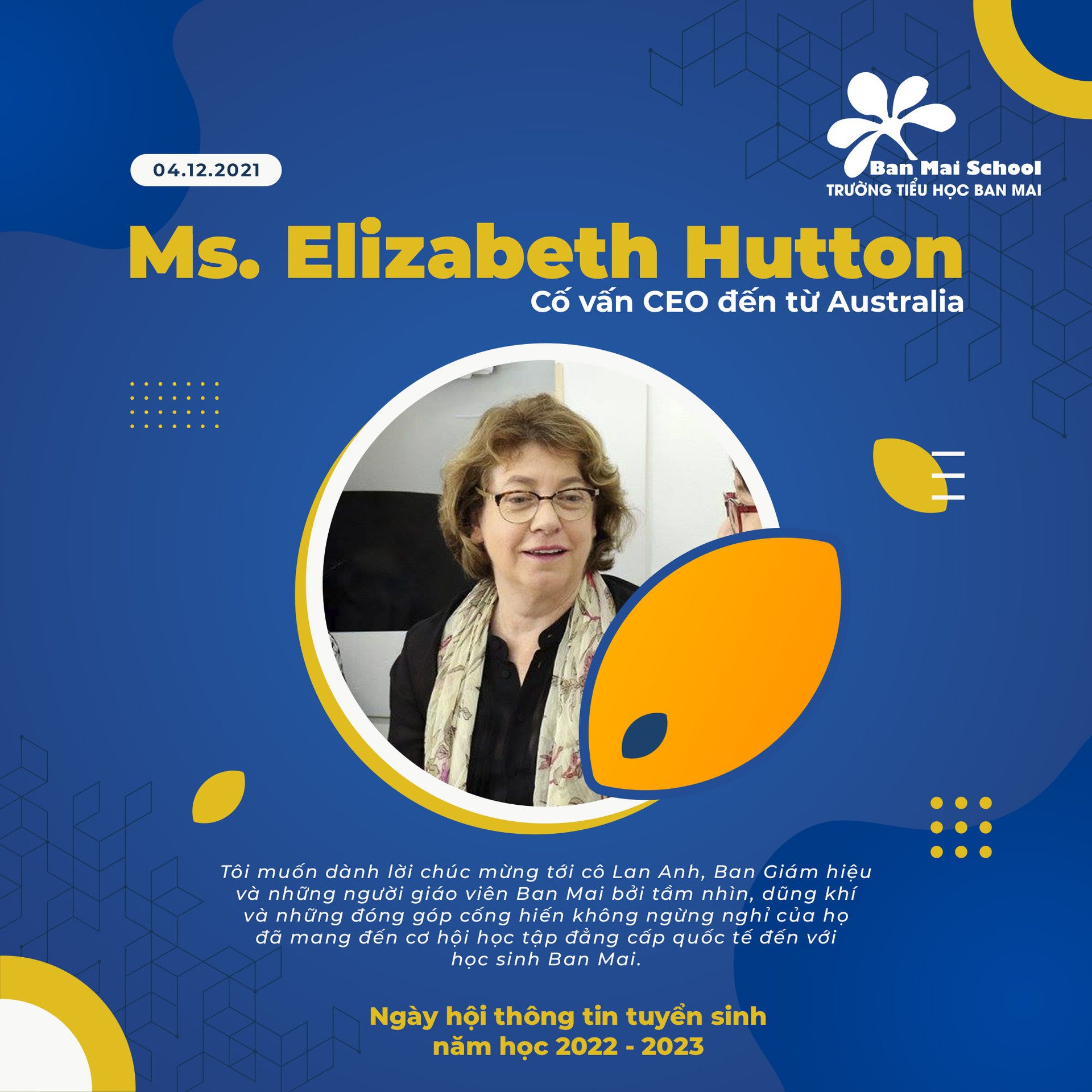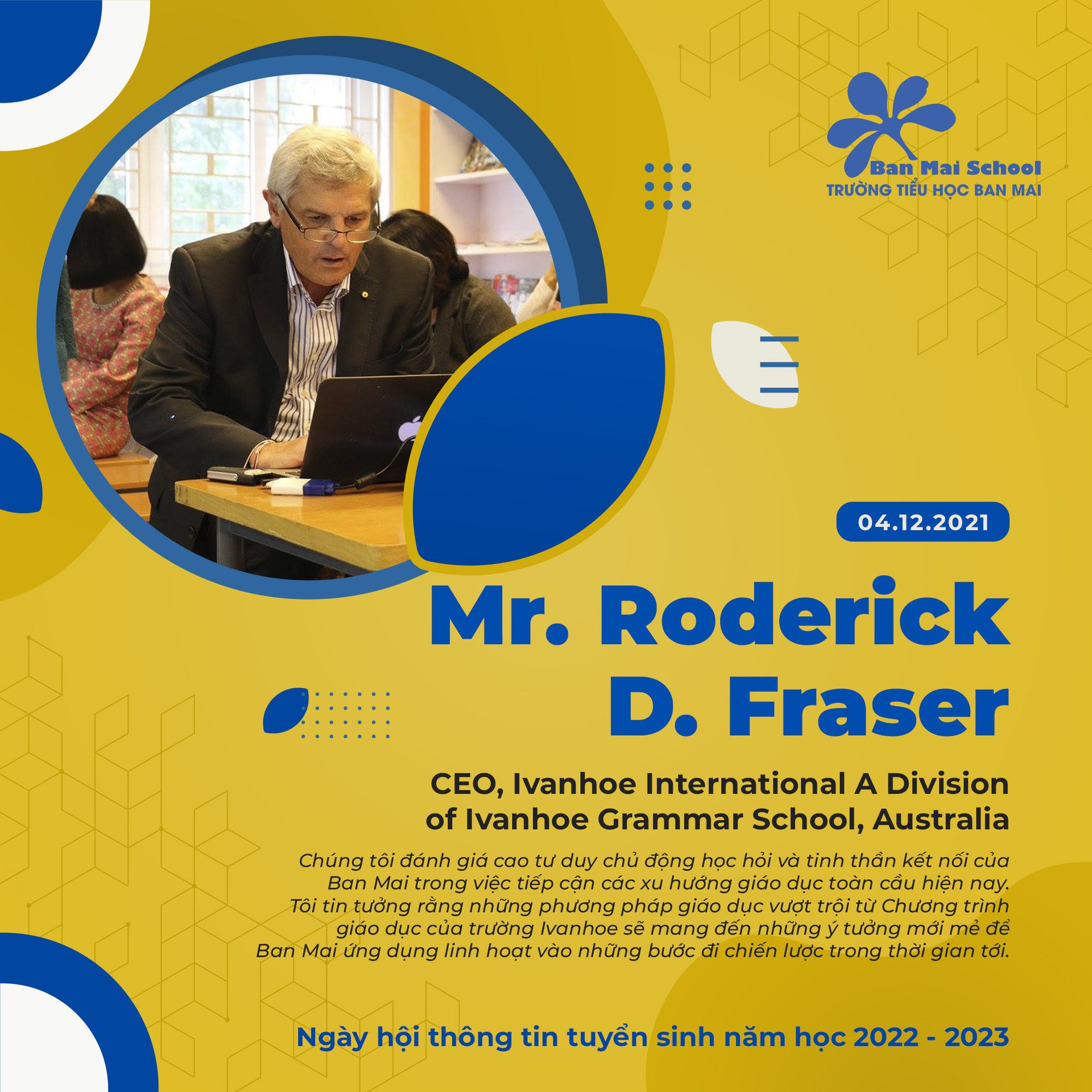 Chúng tôi đánh giá cao tư duy chủ động học hỏi và tinh thần kết nối của Ban Mai trong việc tiếp cận các xu hướng giáo dục toàn cầu hiện nay. Tôi tin tưởng rằng những phương pháp giáo dục vượt trội từ Chương trình giáo dục của trường Ivanhoe sẽ mang đến những ý tưởng mới mẻ để Ban Mai ứng dụng linh hoạt vào những bước đi chiến lược trong thời gian tới.