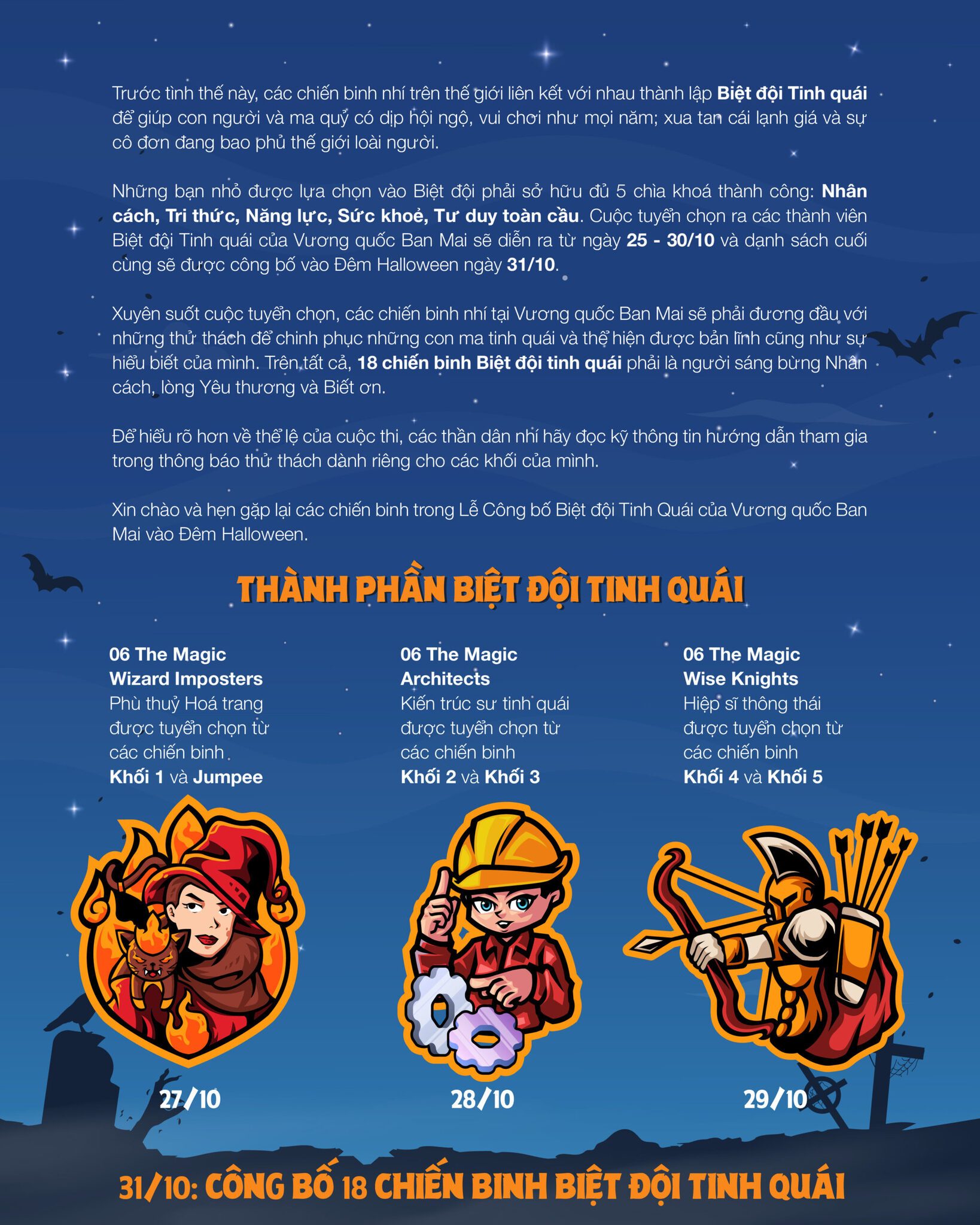 Chuỗi Các thử thách Halloween: Chiêu mộ Biệt Đội Tinh Quái – The Magic Warriors, gồm: 6 phù thủy hóa trang, 6 kiến trúc sư tinh quái, 6 hiệp sĩ thông thái. Thời gian: từ 25/10 – 31/10.