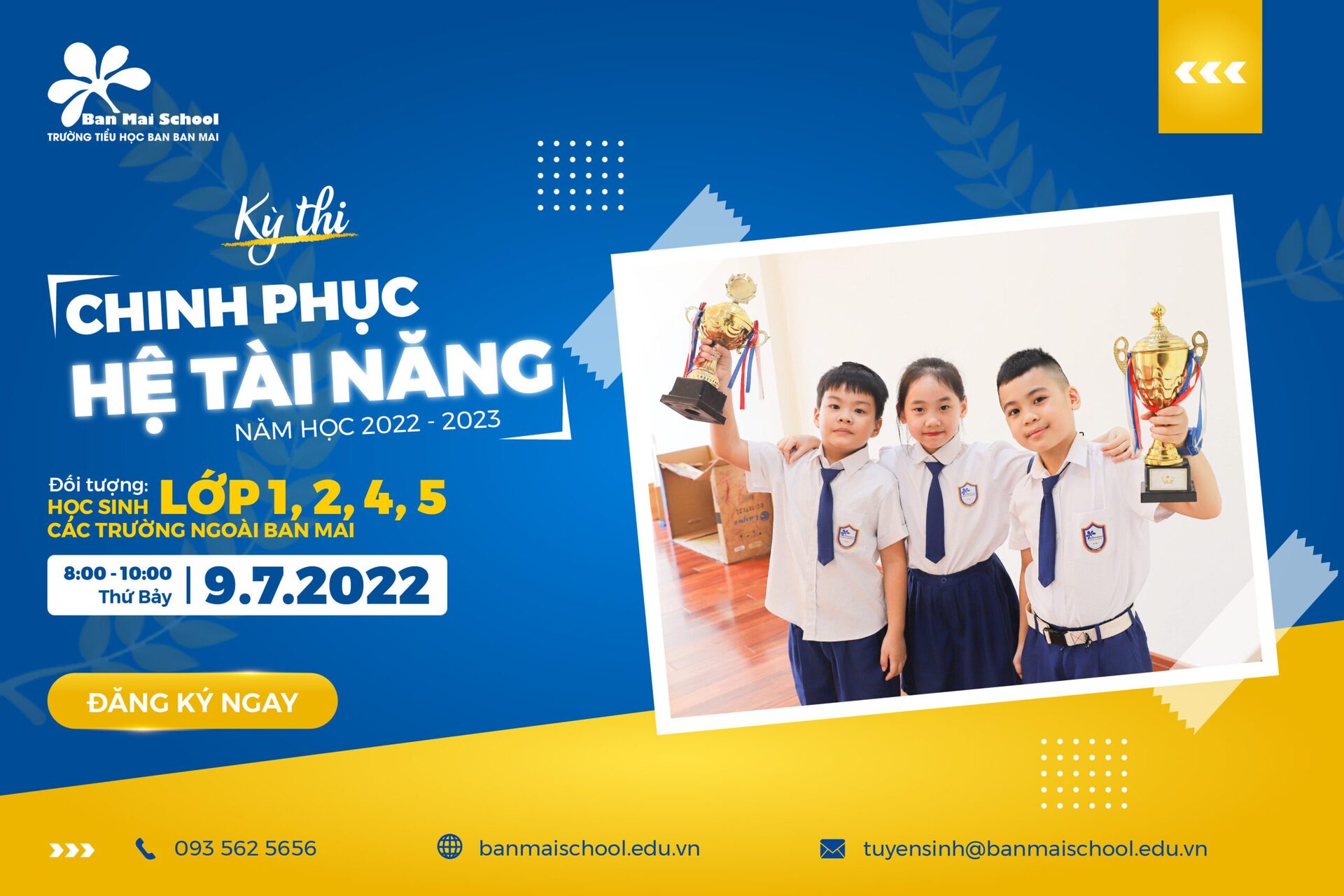 Thứ Bảy, ngày 9/7/2022, Ban Mai School tổ chức Kỳ thi Chinh phục Hệ Tài năng năm học 2022 – 2023 dành cho các học sinh chưa học tại Ban Mai có cơ hội trở thành niềm tự hào của lớp T tại Ban Mai.
