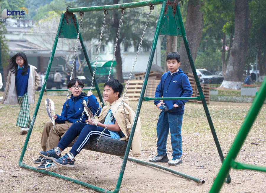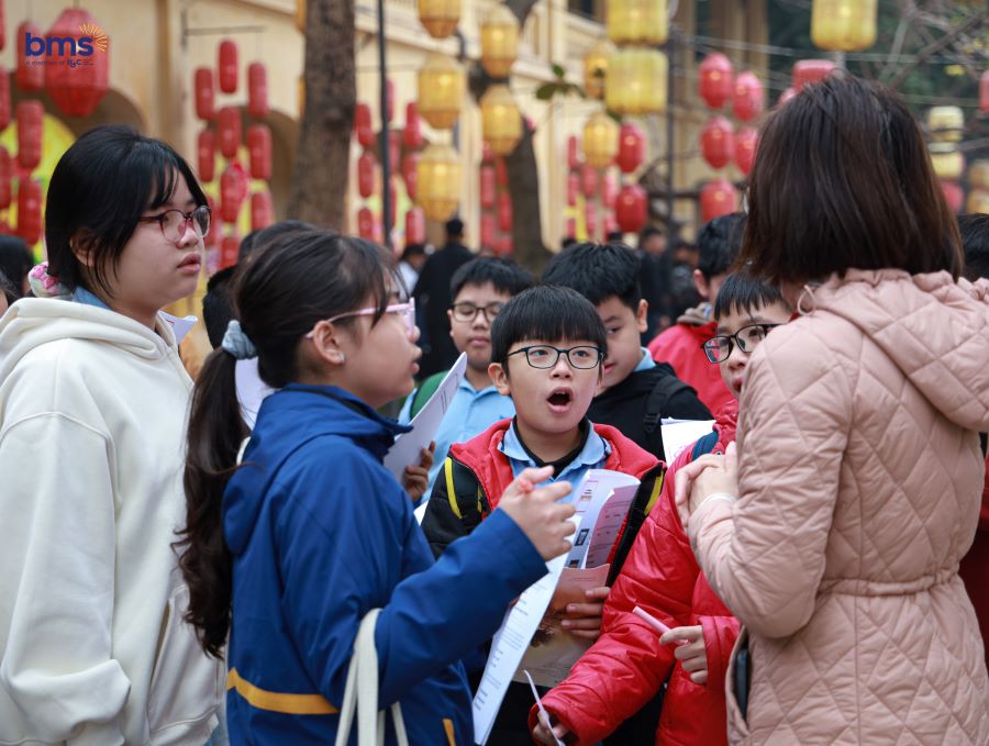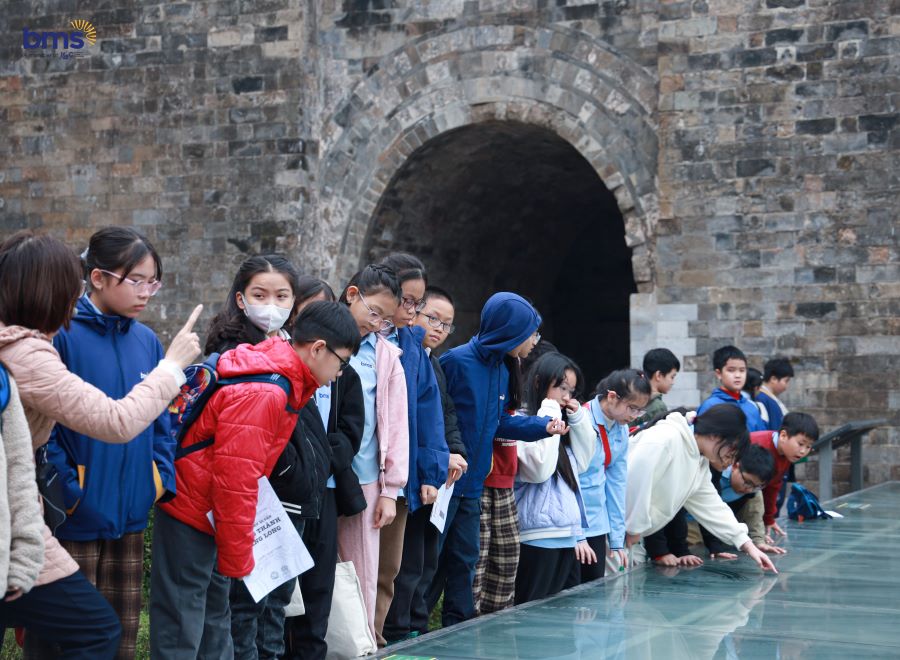 BMSers đặc biệt hứng thú khi tham quan Sân Đan Chì, nơi diễn ra những nghi thức quan trọng của triều đình xưa. Các em chăm chú lắng nghe với ánh mắt tò mò, khao khát tìm hiểu về di tích lịch sử. Qua từng bước chân, lịch sử dường như hiện lên rõ nét hơn, không còn là những trang sách khô khan mà là những câu chuyện sống động, truyền cảm hứng sâu sắc.