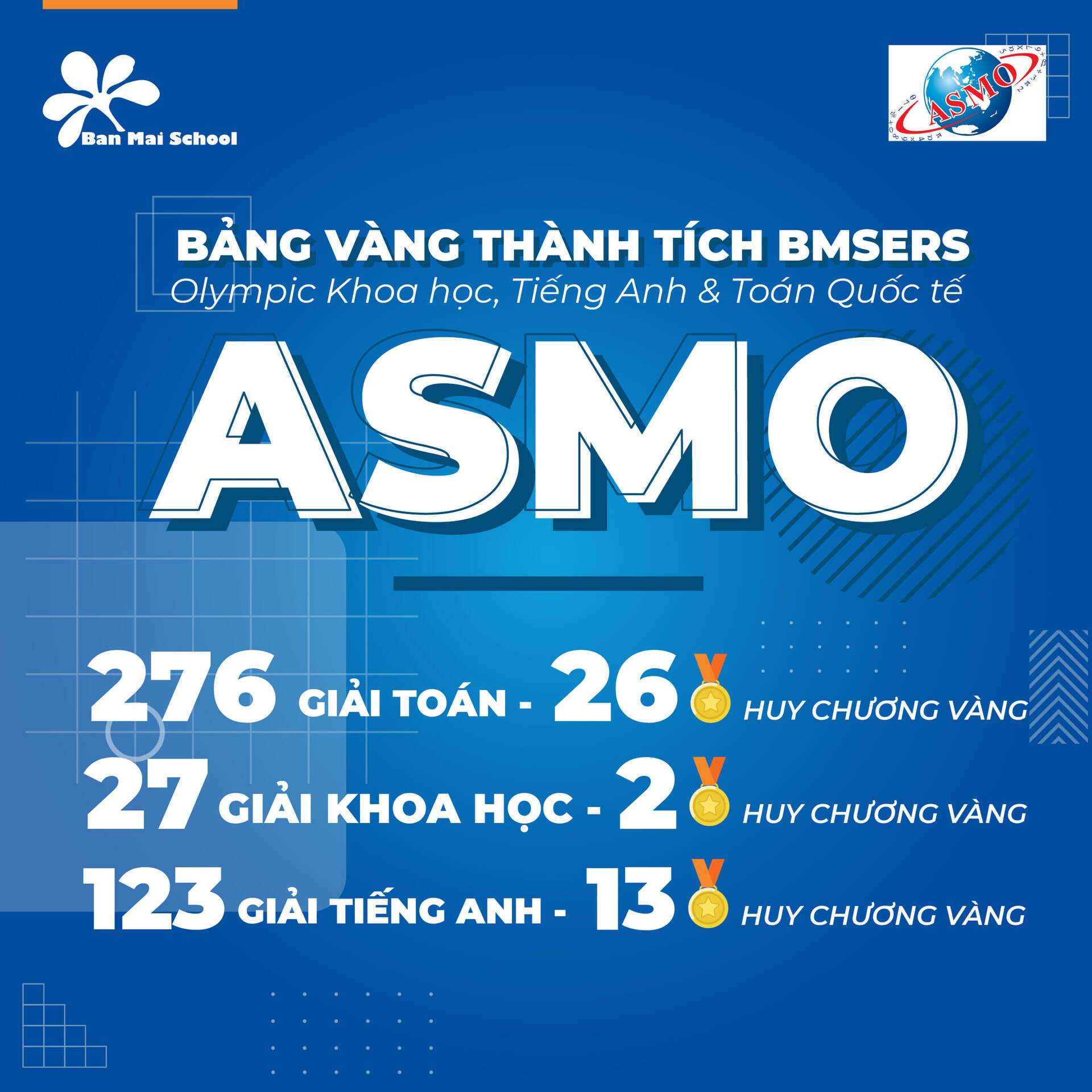 Ở vòng 1 kỳ thi ASMO 2020, các BMSers đã nhận về một CƠN MƯA THÀNH TÍCH với tổng số 432 giải thưởng ở cả 3 bộ môn: Toán, Tiếng Anh, Khoa học, trong đó gồm: