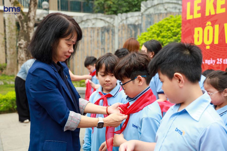 Ngay sau đó, Lễ Kết nạp Đội cho học sinh Khối 3 năm học 2024 - 2025 đã diễn ra trong không khí trang nghiêm tại Đài tưởng niệm. Khi lá cờ đỏ sao vàng tung bay trong gió, các em đồng thanh cất vang lời hứa Đội viên, tự hào đeo lên vai chiếc khăn quàng đỏ – biểu tượng cao quý của Đội Thiếu niên Tiền phong Hồ Chí Minh. Giây phút ấy không chỉ là niềm vinh dự lớn lao, mà còn là dấu mốc quan trọng trong hành trình trưởng thành của mỗi BMSer. Chiếc khăn quàng đỏ trên vai như một lời nhắc nhở, một động lực để các em không ngừng phấn đấu, rèn luyện đạo đức, trau dồi tri thức, trở thành con ngoan, trò giỏi, cháu ngoan Bác Hồ, xứng đáng với truyền thống vẻ vang của Đội.