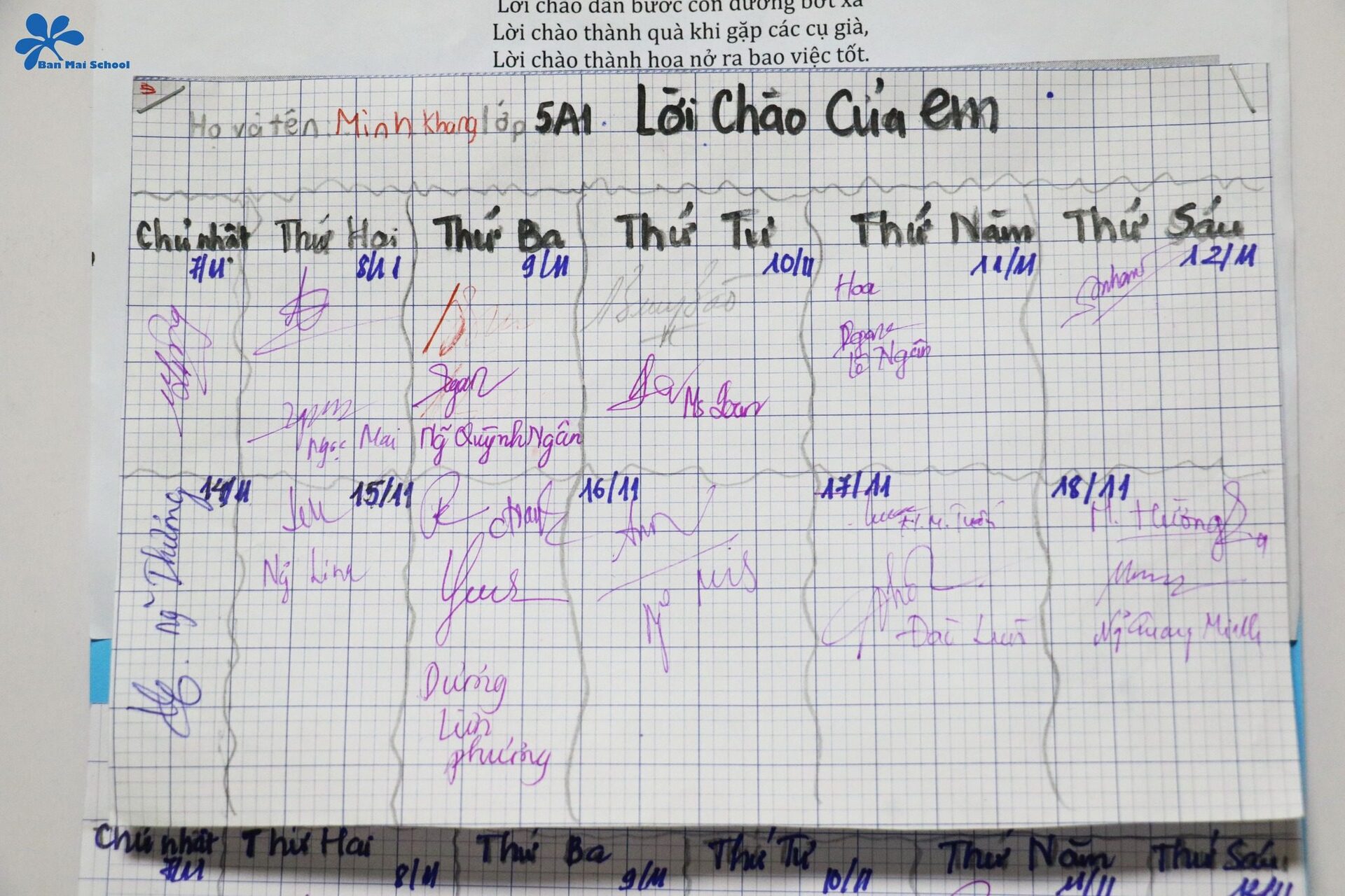 Các con hào hứng với việc làm ý nghĩa, thậm chí còn chuẩn bị sẵn giấy, bút để xin chữ ký của người được chào hỏi để làm minh chứng “khoe” với thầy cô, hạnh phúc vì mình là một học sinh lễ phép.