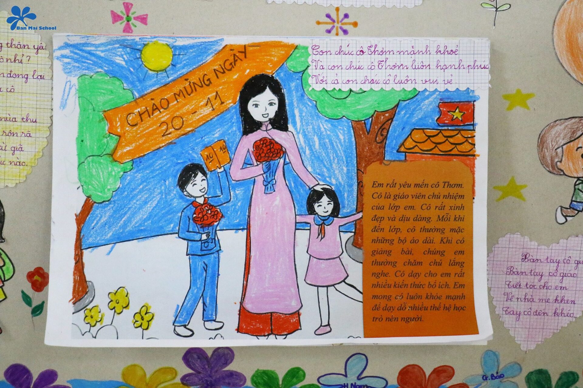 Sự sáng tạo, hợp lực được thấy rõ nhất qua hoạt động làm báo tường. Cả cô trò cùng các bố mẹ cùng chung tay tạo nên những sản phẩm đẹp về hình thức, ấm áp về nội dung để thể hiện tấm lòng “Tôn sư trọng đạo” theo truyền thống của dân tộc.